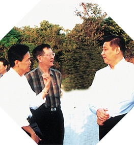 时任厦门大学党委书记王豪杰(右三)、校长陈传鸿(右二)向习近平汇报工作。